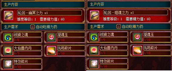 →西杭州城→靈鶴信使:圖樣﹕「輪迴·噬魂之力」、圖樣﹕「輪迴·幽冥之力」,生產製作所需材料如下: